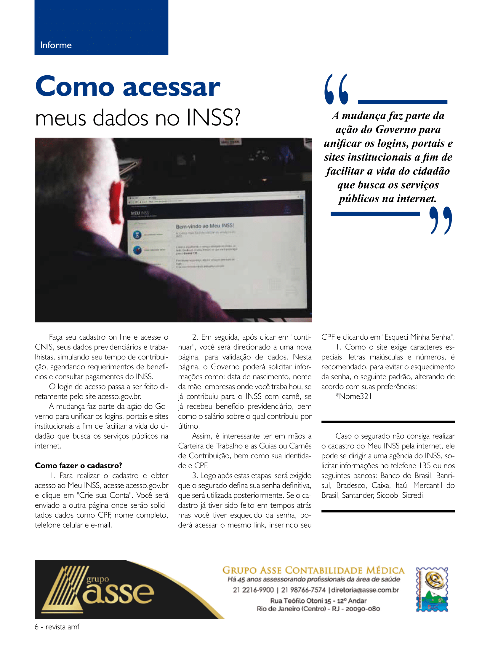 Matéria publicada no mês de setembro/2019 na Revista da Associação Médica Fluminense, com o tema importante diante da reforma previdenciária “Como Acessar meus dados no INSS”: