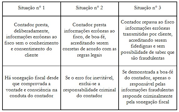 O delito é apenado com multa e reclusão, de 2 (dois) a 5 (cinco) anos. Outra situação é passível de ser representada pela conduta do contador que, ao receber informações prestadas pelo seu cliente e aparentemente fidedignas, repassa-as ao fisco, causando prejuízos fiscais ao Estado (e consequenteproveito econômico à empresa). O quadro abaixo elucida situações acima referidas: